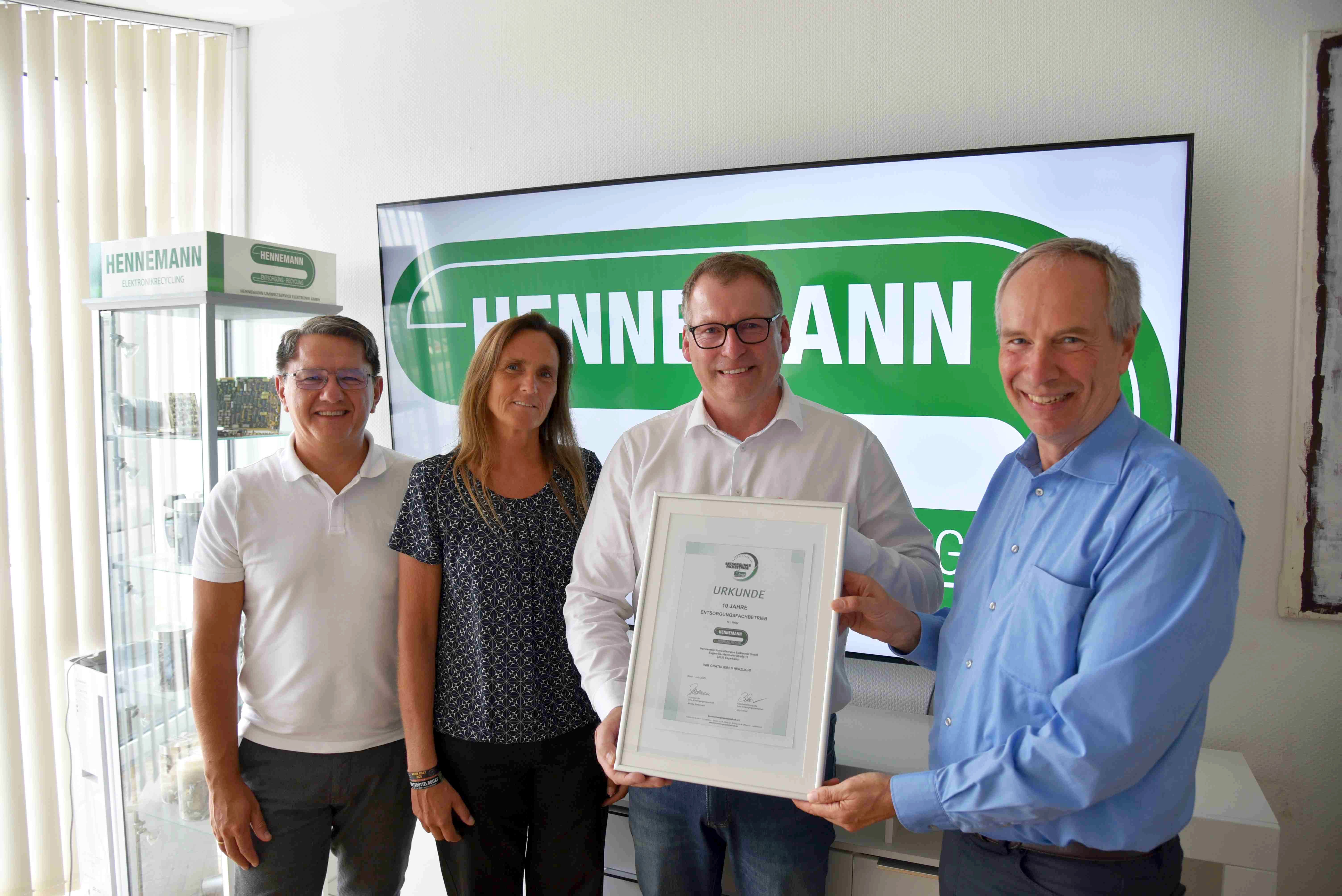 Die Hennemann Umweltservice Elektronik GmbH kann einen bedeutenden Meilenstein feiern: Vor zehn Jahren erhielt das Unternehmen erstmals die Auszeichnung als Entsorgungsfachbetrieb – und seitdem wird diese Zertifizierung ohne Unterbrechung Jahr für Jahr bestätigt.